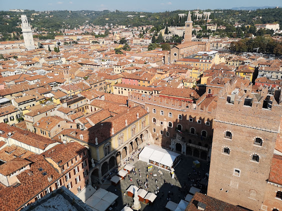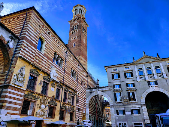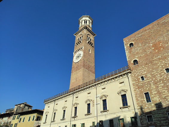 The Torre dei Lamberti is an impressive medieval tower standing 84 meters tall. Visitors can climb to the top for panoramic views of Verona.